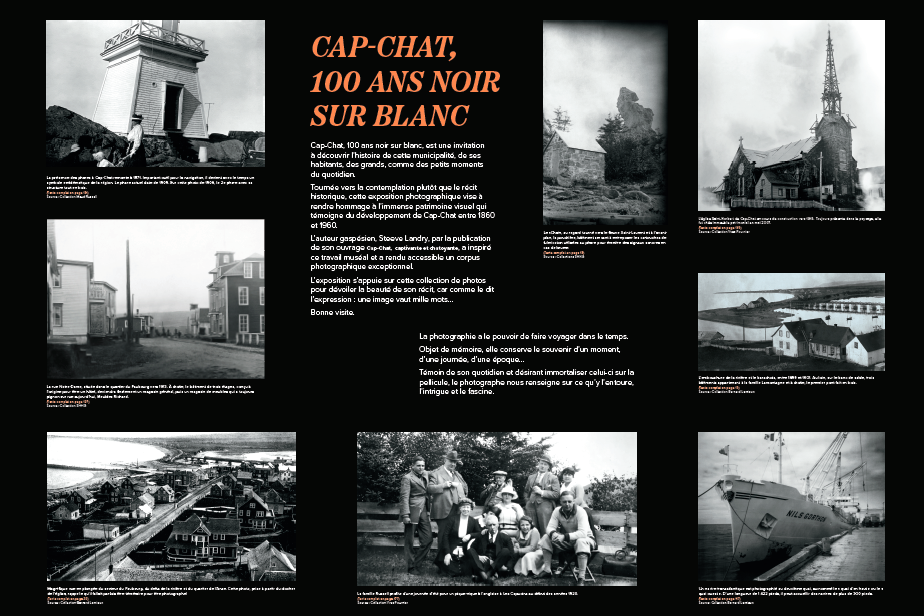 Tourisme vers la contemplation plutôt que le récit historique, cette exposition photographique vise à rendre hommage à l’immense patrimoine visuel qui témoigne du développement de Cap-Chat entre 1860 et 1960.
